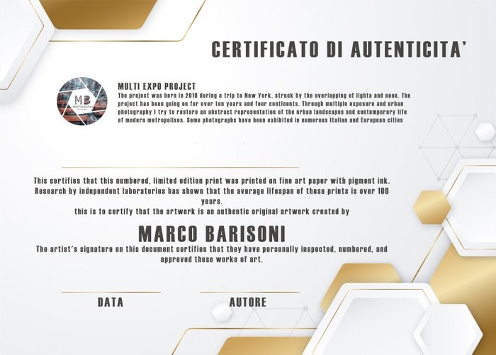 Het project ontstond in 2010 tijdens een reis naar New York, getroffen door de overlapping van licht en neon. Het project loopt al meer dan tien jaar en vier continenten. Door middel van meervoudige belichting en stadsfotografie probeer ik een abstracte representatie van de stadslandschappen en het hedendaagse leven van moderne metropolen te herstellen. Sommige foto's zijn tentoongesteld in tal van Italiaanse en Europese steden.