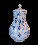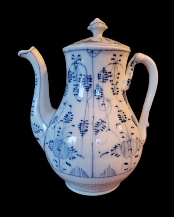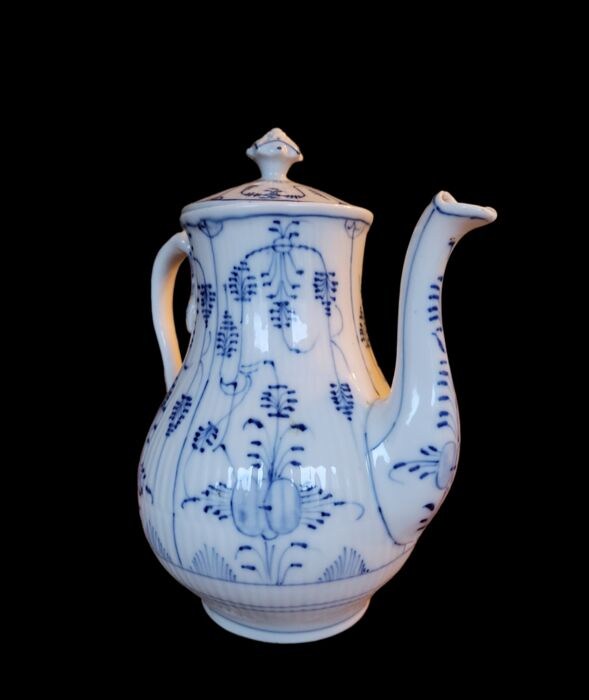 Een antieke porseleinen koffie pot, met de hand versierd in blauw op een witte geribbelde basis met strawflower patroon. Daterend uit de tweede helft van de 19e eeuw.