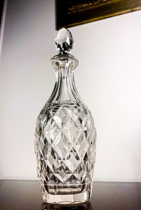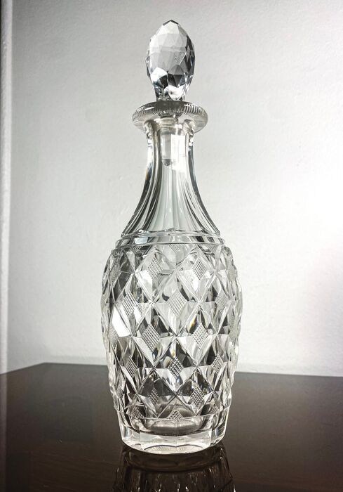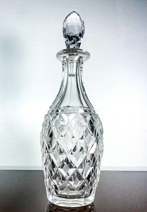 Charmante kristallen zeldzame likeurkaraf fabricage Montcenis Le Creusot Restauratietijdperk. Circa jaren 1820-30. Uniek en rijk ontwerp, verzamelaar
