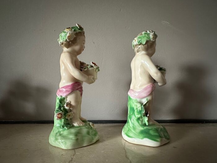 Twee onderwerpen in 18e-eeuws Engels porselein die cupido's voorstellen die gebloemde manden in hun handen houden (allegorie van de lente). Ze rusten op een groen beglaasd terras (gras) en leunen op een bloeiende struik. Bijna naakt dragen ze een roze laken op de heupen en een krans van bladeren en bloemen in hun haar. Zeker een productie van de Manufacture of Bow of Derby (Engeland), opgericht in 1744 en gesloten in 1776. Beschadigd en vervolgens ruw gerestaureerd (zie foto's). Zou een hervatting van de restauratie vereisen.