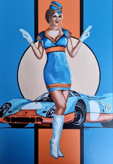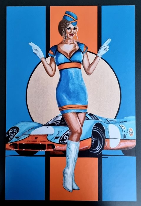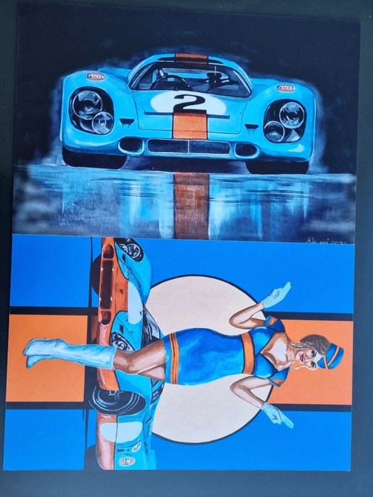 Het kunstwerk PORSCHE GULF RACING werd eerst geverfd, gescand en overgebracht op een displaykarton met behulp van een hoogwaardig drukproces.
