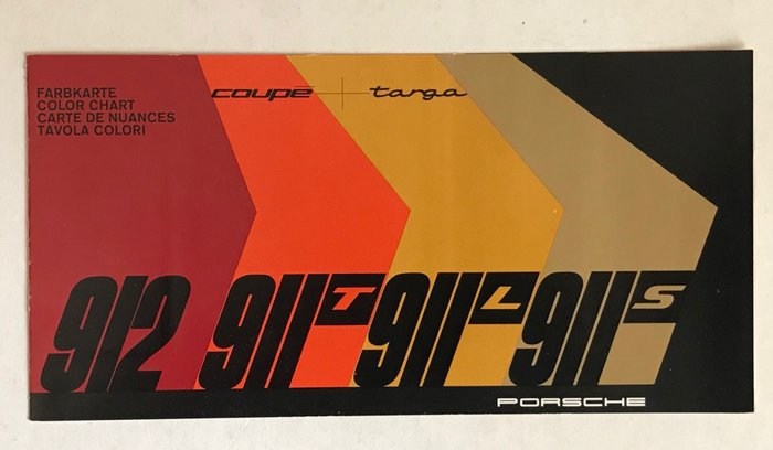 Porsche 911-912 kleurenbrochure in het Duits, Engels, Frans, Italiaans 4 pagina's in kleur, artikel W 25 vanaf 5.67. Twee kleuren enigszins geruïneerd. Meer een 2-3 dan 2 in conditie.