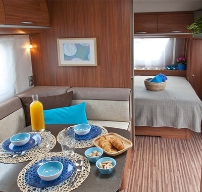Standaard caravan voor 4 personen: De caravan is verdeeld in twee ruimtes: slaapkamer met een tweepersoonsbed aan de ene kant en de woonkamer die om te bouwen is tot een tweepersoonsbed aan de andere kant. Keuken en badkamer met chemische toilet. Voortent uitgerust met een tafel en 6 stoelen en hoogwaardig grondzeil, een kleine koelkast, bbq, parasol, etc.