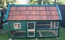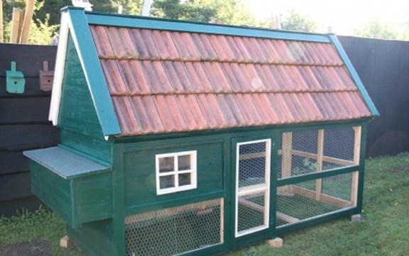 Landelijk kippenhok met oranje dakpannen, geschilderd in donker groen met creme. Bezorgen is mogelijk in overleg in NL, BE en DE.