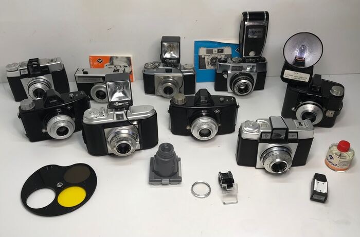 Agfa Clack + Flash, Agfa Click I, Agfa Click II, Agfa Agnar 6.3/55, Agfa Isoly, Agfa Isola + Iso Flash en een Agfa Iso-Rapid, Agfa Silette-L met paraplu Agfalux flitser, Agfa Silette + Isi flitser, 2x Agfa Notarix zoeker, agfa cirkelfilter, Agfa Gucki 3D, Agfa Cinecol in doos, 2 handleiding Agfa Iso Rapid handleiding