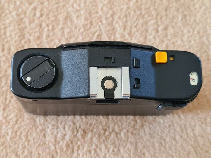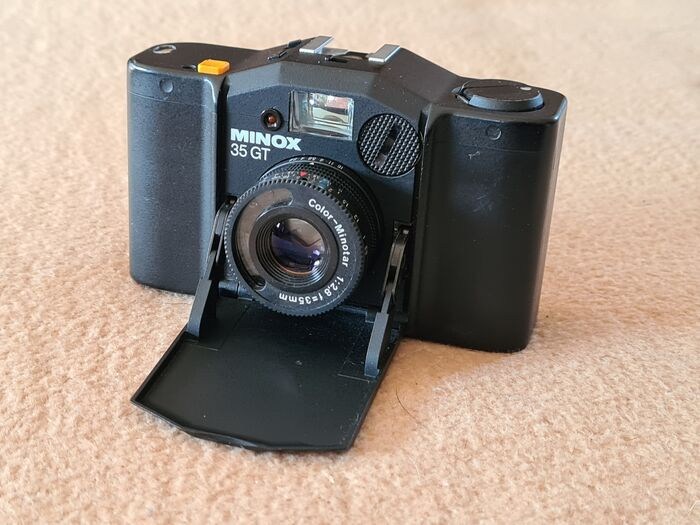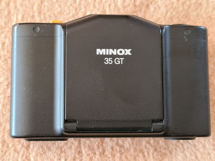 Minox 35GT, goede staat, lichte gebruikssporen, veel gebruikt, komt met nieuwe batterij. DIN schaal licht versleten maar nog leesbaar. Alle functies zijn getest, camera werkt perfect. Batterijvak is schoon, geen lekkende batterijen, filmtransport is wat stroef, net als het opwindhendeltje, deze blijft soms wat hangen aan het uiteinde, maar dat is geen probleem.