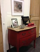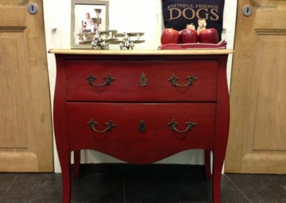 Commode rood gelakt met eiken blad boven, twee lades, NIEUW