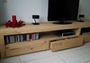 Het tv-meubel Maxi is een modern wandmeubel waar een megacollectie dvd’s en cd’s in opgeborgen kunnen worden. De laden lopen soepel op rollagers en boven de laden is veel ruimte voor alle audioapparatuur. De maten mogen er wezen: 300 tot 350 cm lang en andere afmetingen op aanvraag. Het gebruik van duurzaam eiken maakt van dit meubel beslist een blijvertje. Op de 3e foto Sandy met 2 laden.