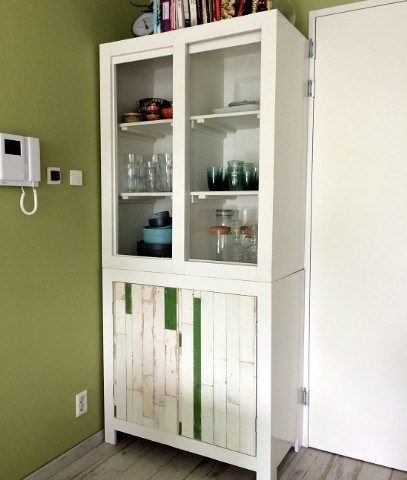 Zo mooi, deze witte buffetkast met sloophout deurtjes. Op maat en naar wens van de klant gemaakt. Zowel onder- als bovenkast heeft 2 legplanken met in het midden een steunwandje zodat je er ook wat zwaardere spullen als bijv. serviesgoed in kwijt kan.