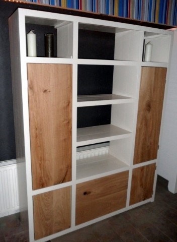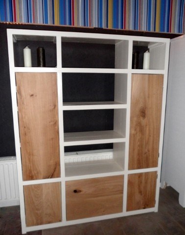 Strak wit wandmeubel met eiken deuren: modern & rustiek, een mooie combinatie. Een verrijking voor ieder interieur!