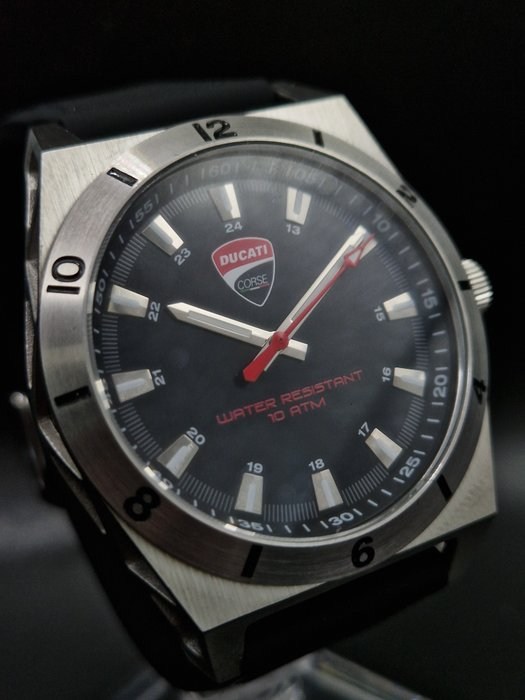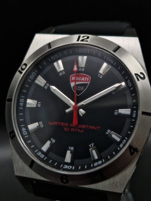 Het horloge heeft een zwarte wijzerplaat met Ducati Corse opdruk.