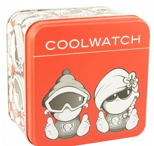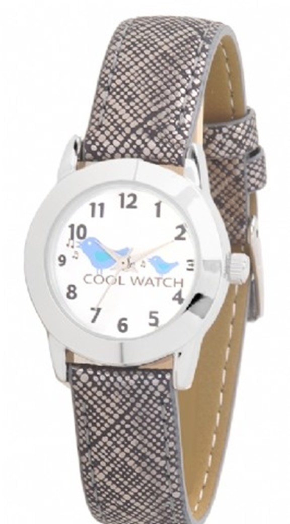 Cool Watch meisjes-horloge, voorzien van een zwart met zilverkleurig leren bandje met grijs stiksel, dat in lengte verstelbaar is door een gespsluiting. De wijzerplaat is wit, waarbij de cijfers zijn uitgevoerd in zwart. Op de wijzerplaat staan een grote en een kleine blauwe vogel met elk een groene vleugel en bruine zangnoten afgebeeld. De buitenrand is zilverkleurig.