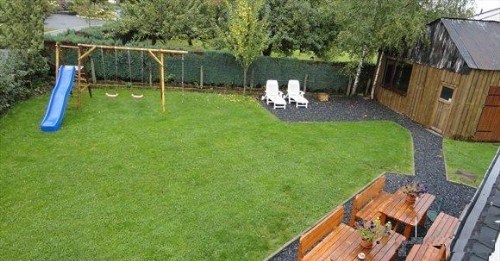 kompleet met terrassen, speelweide, speeltoestel en een groot tuinhuis van 50 m2 met uitzicht