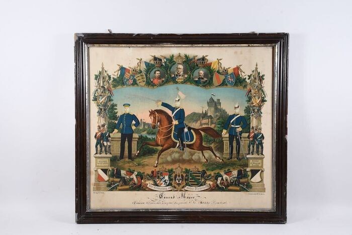 de soldaat Conrad Moser, waarschijnlijk eind 19e eeuw. Kleurenlithografie met ingezette portretten, ingelijst achter glas. Het document is in goede staat, de antieke lijst is door de leeftijd in zwaar gebruikte staat, zie foto's.