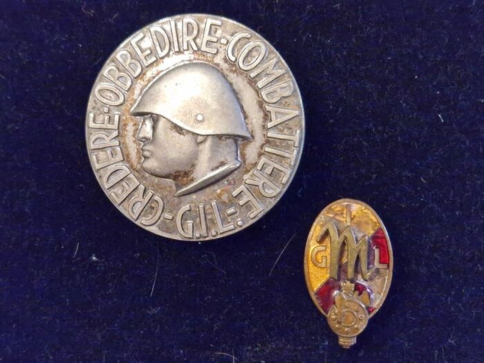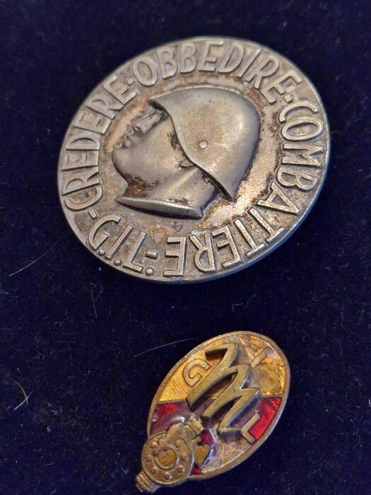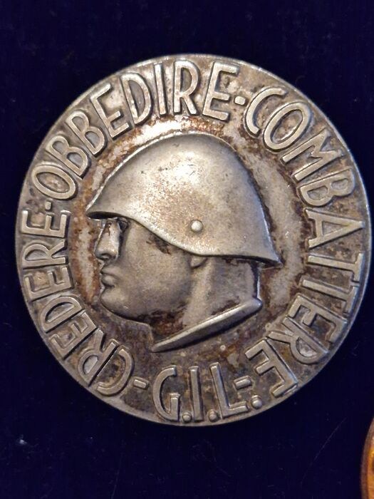 - Ronde aluminium broche met het motto DUCE Credere Obbedire Combattereo in de GIL (Italian Youth of the Littorio) pin met merken op de achterkant van het commando en de fabrikant