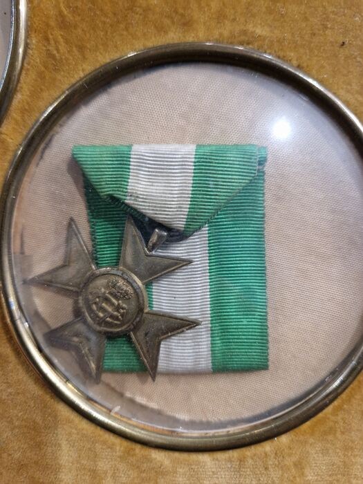 De set is erg mooi, elegant en ingelijst met glazen bubbels die open kunnen, en met kostbare fluwelen stof die ook als medaillehouder op tafel kan worden weergegeven. Zeldzaam object met grote charme, typisch eind 1800 en begin 1900