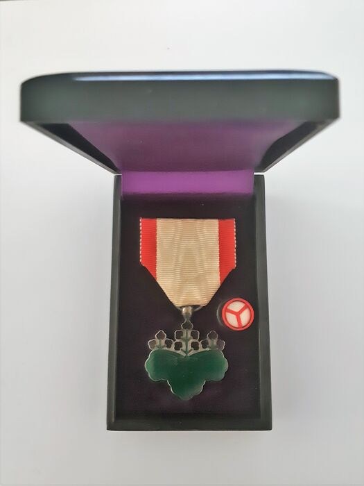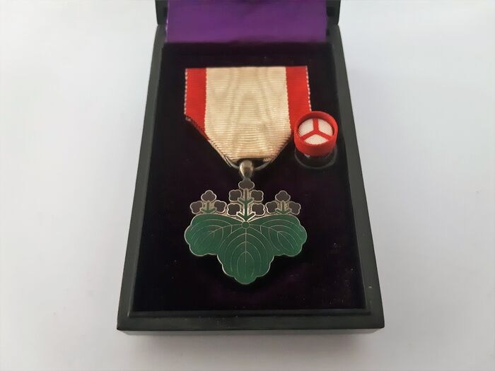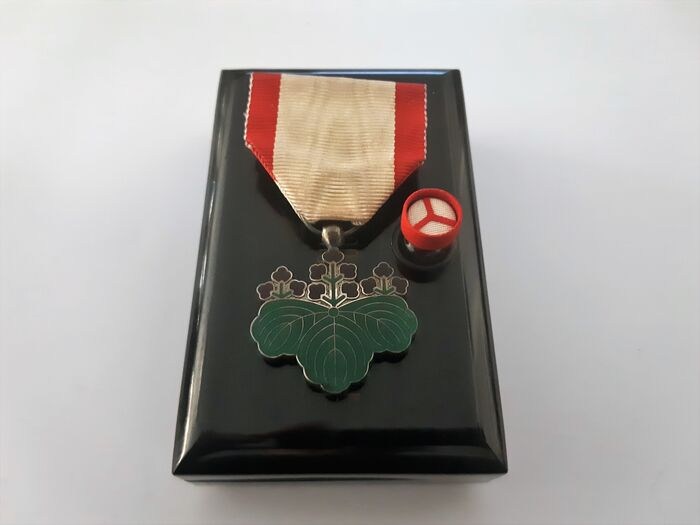 WW2 zilveren Japanse Orde van de Rijzende Zon 7e klasse met origineel zijden lint, originele speld en originele gelakte speciale doos (antitank medaille).