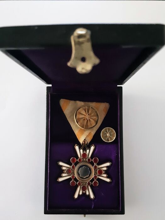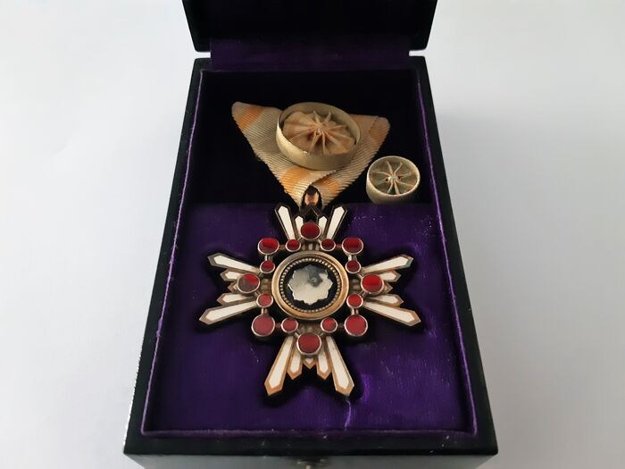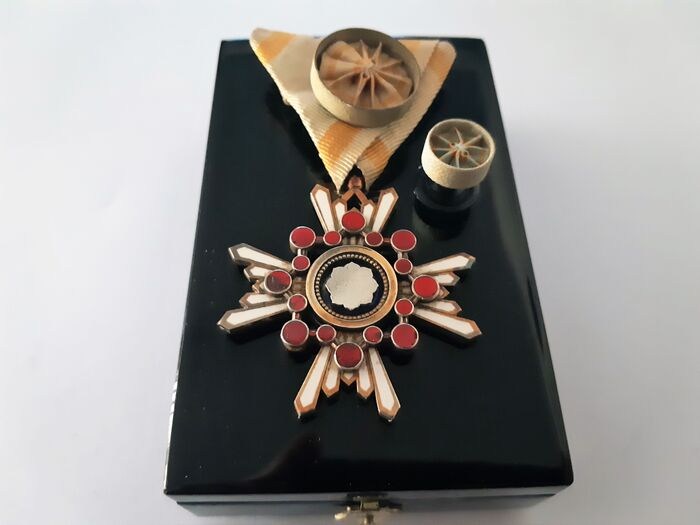 Zeer zeldzame WW2 Japan zilveren (vergulde) Order Of The Sacred Treasure 4th Class met originele zijden lint, originele badgepin en originele gelakte doos.