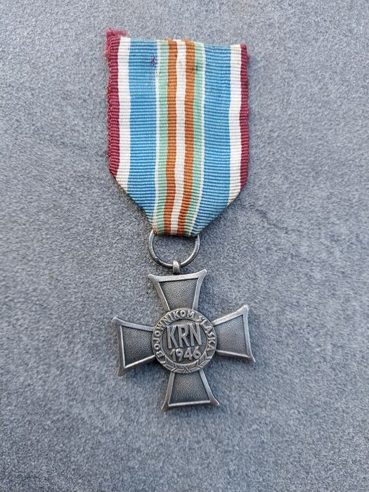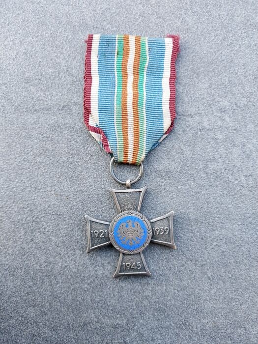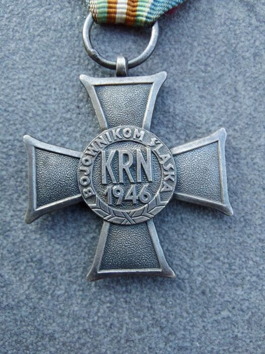 Verzilverd metalen kruispattée, de oppervlakken van de armen gestippeld, met zijdelings doorboorde ring voor lintophanging; het gezicht met een centraal rond medaillon van lichtblauw email met de Poolse adelaar, de linker-, rechter- en onderarmen van het kruis met respectievelijk de data '1921', '1939' en '1945'; de keerzijde met een rond centraal medaillon met de inscriptie 'KRN' (Nationale Raad) en gedateerd '1946' met de omtrek 'BOJOWNIKOM SLASKA' (aan de jager voor Silezië); De medaille werd ingesteld door de Nationale Raad op 18 oktober 1946 en uitgereikt aan deelnemers aan de Silezische opstanden van 1919, 1920 en 1921. Een clausule in het Verdrag van Versailles tussen de zegevierende geallieerden en Duitsland aan het einde van de Eerste Wereldoorlog eiste zelfbeschikking voor Opper-Silezië. De volksraadpleging (volksreferendum) werd gehouden op 20 maart 1921 en resulteerde in een meerderheid voor Duitsland, maar de Polen waren van mening dat het resultaat oneerlijk was en de derde Silezische opstand brak uit op 2 mei 1921, waarbij de Polen snel tweederde van het grondgebied bezetten. Het geschil werd voorgelegd aan de Raad van de Volkenbond, die ongeveer de helft van de bevolking en een derde van het land, inclusief de meeste waardevolle steenkool- en ijzervoorraden, aan Polen toekende. De medaille werd ook uitgereikt aan degenen die tijdens de Tweede Wereldoorlog lid waren geweest van het Poolse verzet in Silezië.