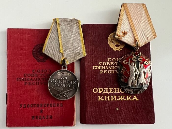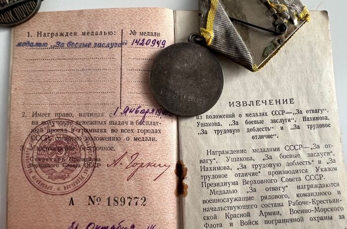 - USSR zilveren medaille voor militaire verdienste (serienummer 1.420.949) met certificaat. Toegekend aan WO II-veteraan sergeant Michael Schmigal in januari 1945 voor de uitstekende dienst in Sovjet Naval Aviation-troepen van de Noord-marine (Moermansk). Digitaal archief van de veteraan is openbaar beschikbaar op de website van Pamyat Naroda;