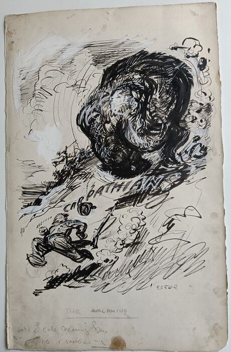 Oscar Edward Cesare (1883-1948) was een Amerikaanse cartoonist. Deze prent (titel 'The Avalanche') is het oorspronkelijk ontwerp voor een editoriaal cartoon voor de 'New York Morning Sun', Verenigde Staten, 1914. Op de prent zijn de correcties van de tekenaar nog duidelijk te zien.