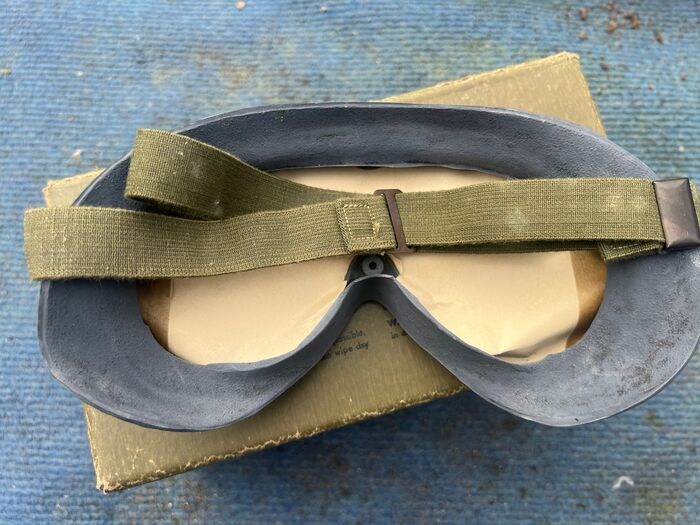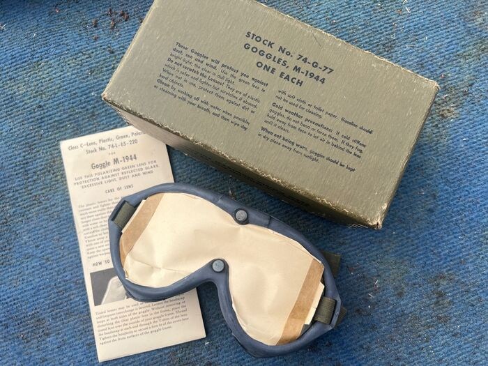 Offered for auction is a beautiful BOXED, unused World War 2 US M-1944 (made in 1945)Tanker Goggles by Polaroid. Complete with adjustable elastic band, spare glasses and original carton box. The goggles are dated 1945. Nice original set in mint and unissued condition. This would be a great addition to a US Tanker or pilot set-up! It even has the original instruction sheet.