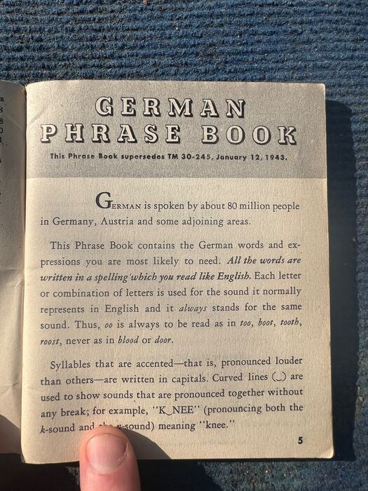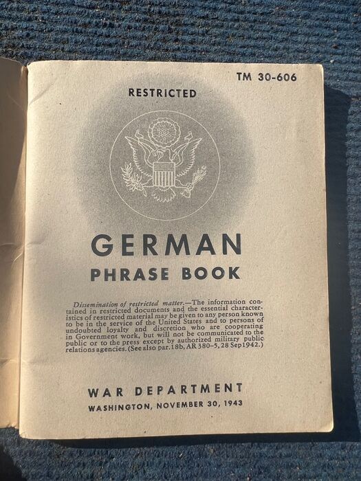 Up for auction is a nice 1943 (EARLY!) copy of the United States Army Technical Manual TM 30-606 entitled "German PHRASE BOOK". It covers many useful German words and phrases. These booklets were issued to the troops just prior to the invasion of Europe, to facilitate interrogation and communication of/between German POW's, German nationals, etc. This example was definitely worn in the field, hence the condition.