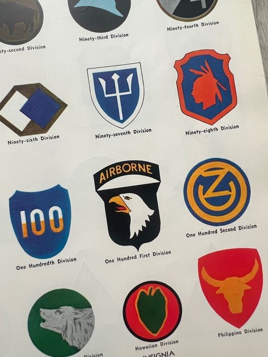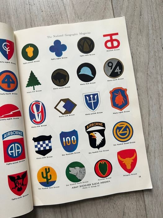 Up for auction is the rare and amazing National Geographic 1943 WW2 Patches, Badges, Insignia Guide!!!This is the highly sought after original June 1943 issue that contains >1700!!!!!! illustrations showing: Color images of all the Army, Navy, Army Air Corps, Marine and Coast Guard divisional patches, insignia, devices, badges and ranks AND MEDALS for all units that took part in World War II! Simply put, this is the best, single source identification guide to collecting United States WW2 INSIGNIA and medals! E.g., Airborne, Navy, Infantry, Ranger, US Bomber, etc etc etc.