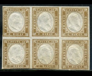 Italiaanse oude staten - Sardinië 1863 - 10 cents bistre. Block of 6 pieces, 5 of which with double effigy. - Sassone 14E