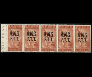 Triëst - Zone A 1947 - Radio airmail, 20 lire. Strip of 5 with oblique overprint. Catalogue €2500 - Sassone N. 9ac
